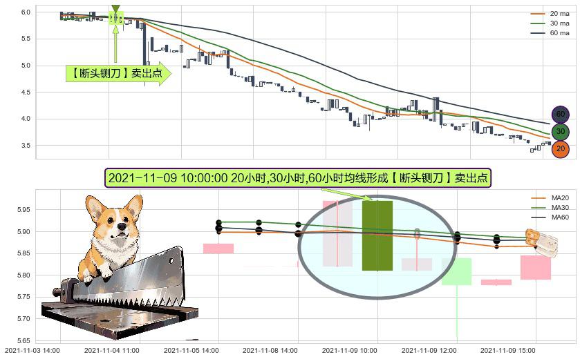 形态多维评估: ⚀ 2021-11-09 10:00:00小时显现 20小时-30小时-60小时均线 【断头铡刀】卖出点 看空信号,后市看跌,卖出