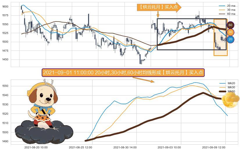 ⚀ 2021-08-25 09:00:00小时-2021-09-09 13:00:00小时显现 20小时-30小时-60小时均线 【烘云托月】买入点 看多信号,后市看涨,买入