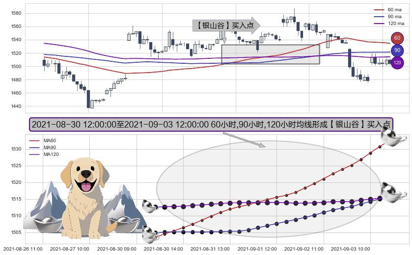 ⚀ 2021-08-30 13:00:00-小时至2021-09-03 12:00:00-小时显现 60小时-90小时-120小时均线 【银山谷】买入点 看多信号,后市看涨,买入