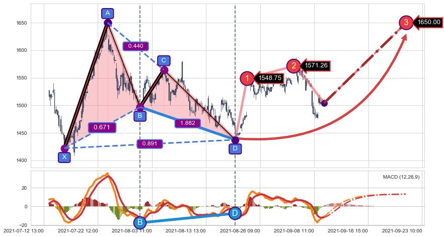 ➢ 谐波价格D点比B点低 ⤵,【MACD】指标D点比B点高 ⤴️