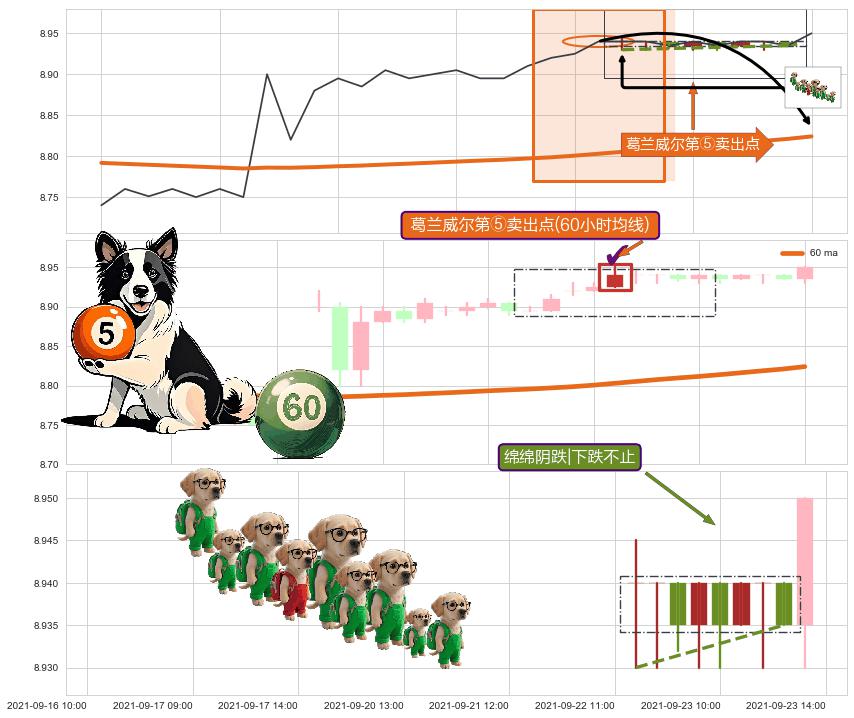 从2021-09-16 10:00至2021-09-23 14:00,共包含35个小时,阶段股价上涨2.45%,阶段股价变动位移路程比: 1 : 2,2021-09-20 09:00向⇪形成缺口,跳空上涨+1.71%