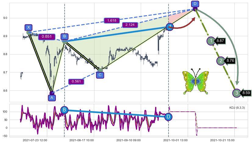 ➣ 未完成【蝴蝶】形态起点X: 07-14:14, 已到达C点: 08-19:11, 预测最终D点: 10-05:15, 共357交易小时