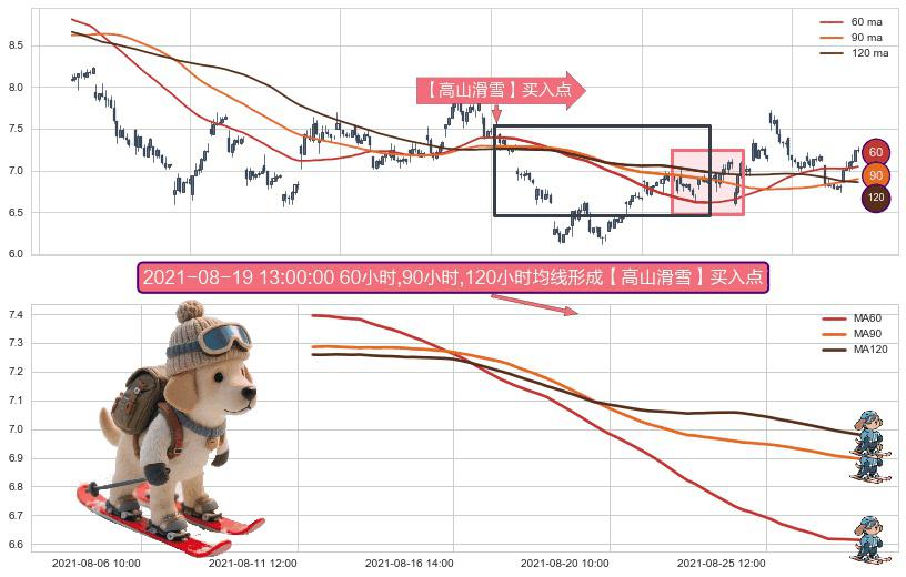 ⚀ 2021-08-11 14:00:00小时-2021-08-27 12:00:00小时显现 60小时-90小时-120小时均线 【高山滑雪】买入点 看多信号,后市看涨,买入