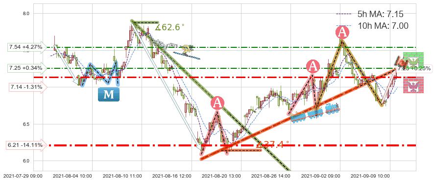 ♘ 阻力价格位7.54,可信任强度53.22%,距离最后交易2021-09-09 14:00形成的收盘价格7.23相差 +4.27%