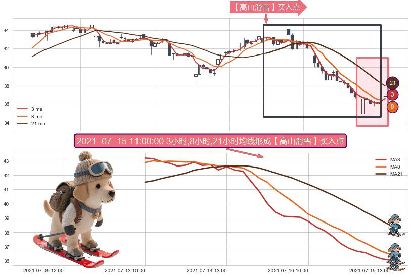 形态多维评估: ⚀ 2021-07-13 10:00:00小时-2021-07-19 13:00:00小时显现 3小时-8小时-21小时均线 【高山滑雪】买入点 看多信号,后市看涨,买入