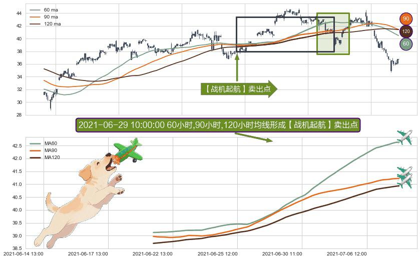 形态多维评估: ⚀ 2021-06-21 14:00:00小时-2021-07-07 15:00:00小时显现 60小时-90小时-120小时均线 【战机起航】卖出点 看空信号,后市看跌,卖出