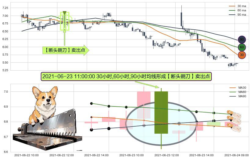 形态多维评估: ⚀ 2021-06-23 11:00:00小时显现 30小时-60小时-90小时均线 【断头铡刀】卖出点 看空信号,后市看跌,卖出