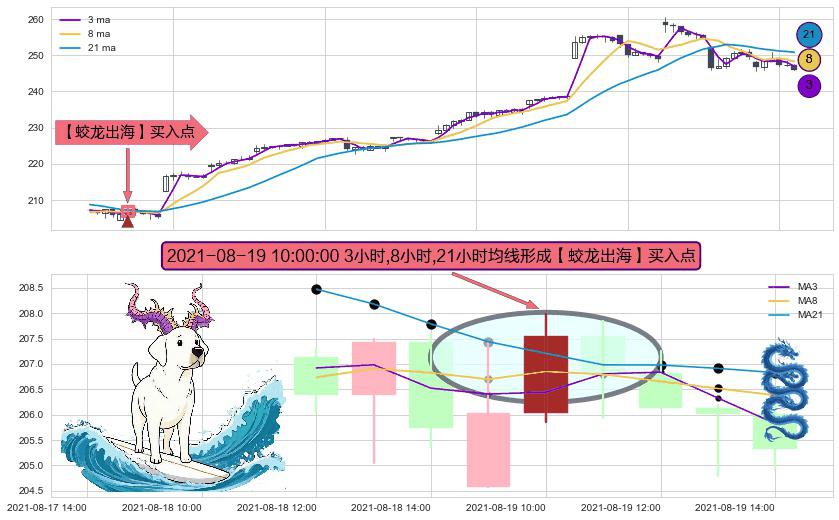 形态多维评估: ⚀ 2021-08-19 10:00:00小时显现 3小时-8小时-21小时均线 【蛟龙出海】买入点 看多信号,后市看涨,买入