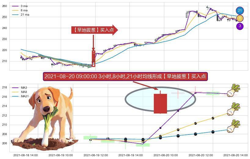 形态多维评估: ⚀ 2021-08-20 09:00:00小时显现 3小时-8小时-21小时均线 【旱地拔葱】买入点 看多信号,后市看涨,买入