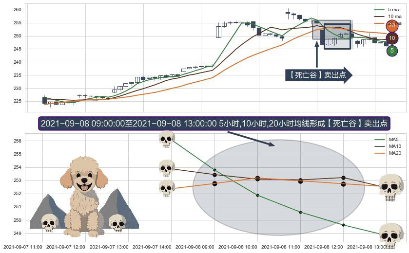 形态多维评估: ⚀ 2021-09-08 10:00:00-小时至2021-09-08 13:00:00-小时显现 5小时-10小时-20小时均线 【死亡谷】卖出点 看空信号,后市看跌,卖出