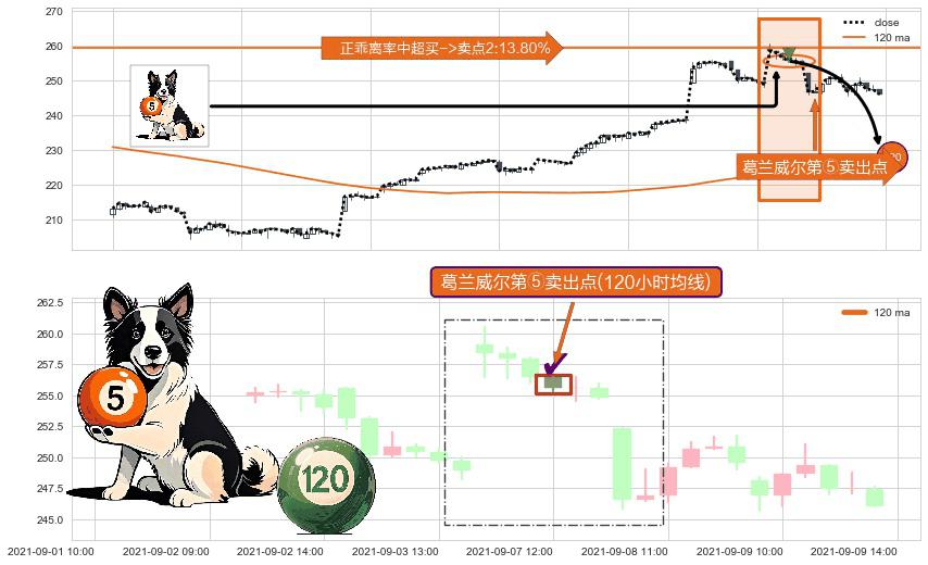 形态多维评估: ⚀ 2021-09-07 12:00:00-小时显现 葛兰威尔均线 120小时均线 第⑤卖出点 上升趋势均值回复的短线回落信号,后市看跌,卖出信号