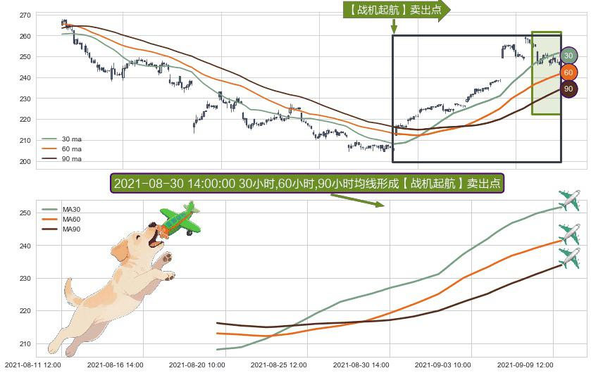 形态多维评估: ⚀ 2021-08-19 14:00:00小时-2021-09-09 14:00:00小时显现 30小时-60小时-90小时均线 【战机起航】卖出点 看空信号,后市看跌,卖出