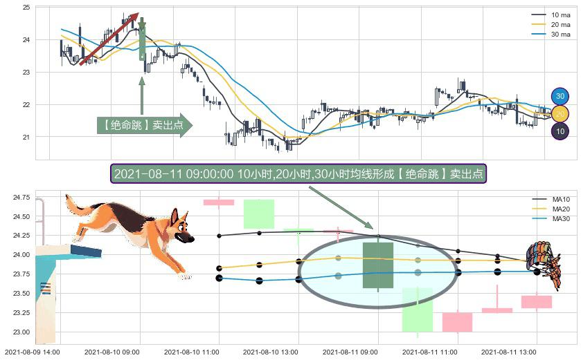 形态多维评估: ⚀ 2021-08-11 09:00:00小时显现 10小时-20小时-30小时均线 【绝命跳】卖出点 看空信号,后市看跌,卖出