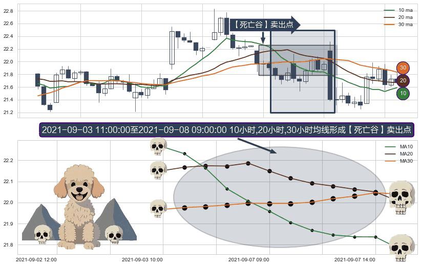 形态多维评估: ⚀ 2021-09-03 12:00:00-小时至2021-09-08 09:00:00-小时显现 10小时-20小时-30小时均线 【死亡谷】卖出点 看空信号,后市看跌,卖出