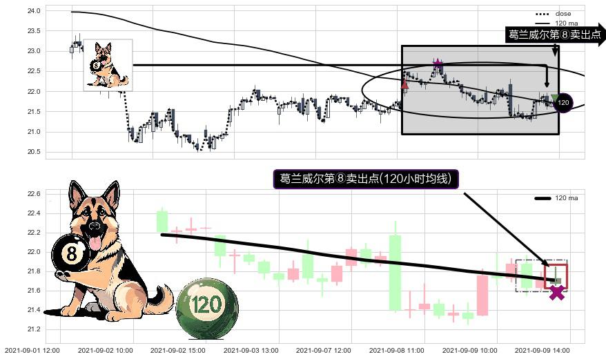 形态多维评估: ⚀ 2021-09-09 14:00:00-小时显现 葛兰威尔均线 120小时均线 第⑧卖出点 下降趋势的中继信号,后市看跌,卖出信号
