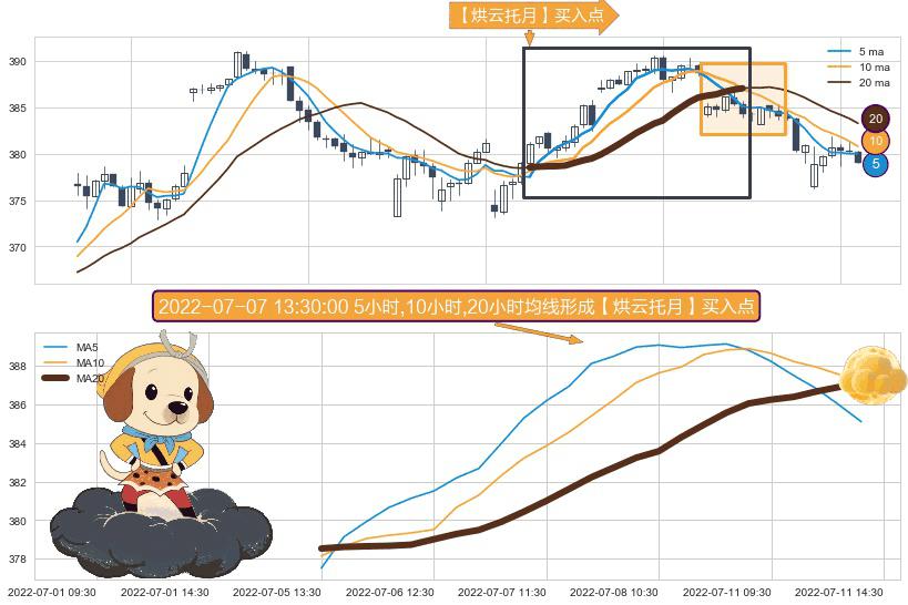 形态多维评估: ⚀ 2022-07-05 13:30:00小时-2022-07-11 13:30:00小时显现 5小时-10小时-20小时均线 【烘云托月】买入点 看多信号,后市看涨,买入