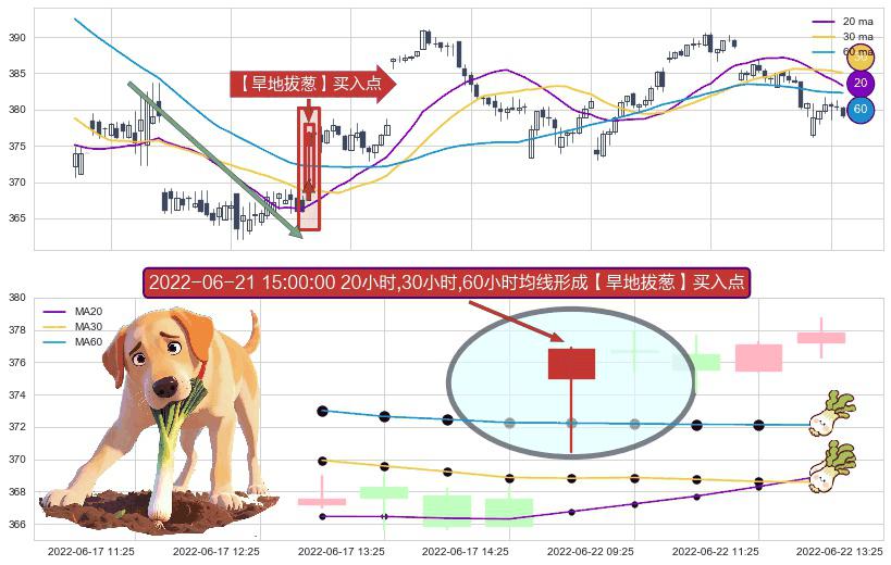 形态多维评估: ⚀ 2022-06-27 10:30:00-小时至2022-07-08 14:30:00-小时显现 30小时-60小时-90小时均线 【金山谷】买入点 其再次确认了买入信号,可靠性更强,买入