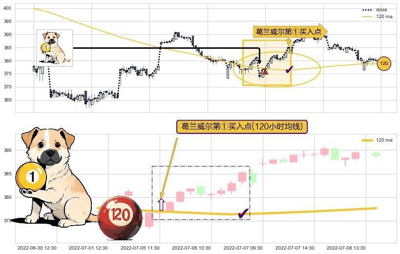 形态多维评估: ⚀ 2022-07-05 11:30:00-小时显现 葛兰威尔均线 120小时均线 第买①入点 走势反转见底信号,后市看涨,买进信号