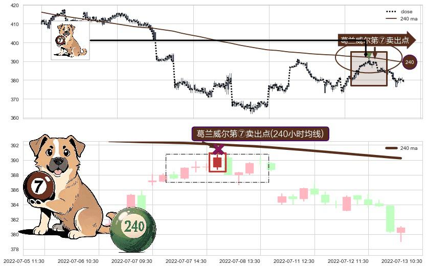 形态多维评估: ⚀ 2022-07-08 09:30:00-小时显现 葛兰威尔均线 240小时均线 第⑦卖出点 下降趋势的中继信号,后市看跌,卖出信号