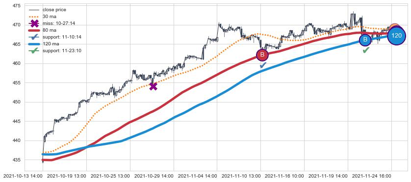 上涨趋势10-13 14:00-11-24 16:00,均线80, 120确认关键支撑2处