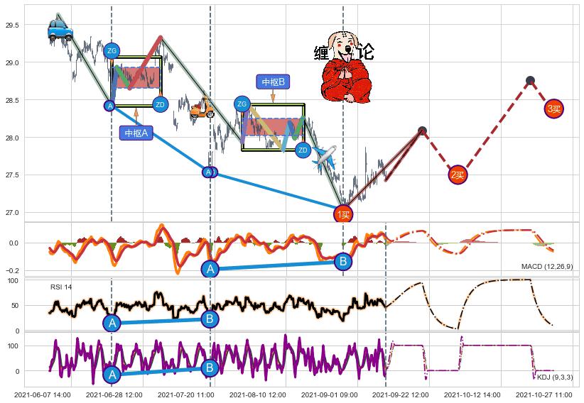 | 6 🅚:【高山滑雪】买入点 ➕ ☯️:缠论买卖点下降缠中枢AB形成后猜想拐点1买已到达,猜想后续持续拉升(均值回复) ☞ 看多信号 ⇥ 【均线】交织【图形】⇥ 综合量化分数: 52 | > |