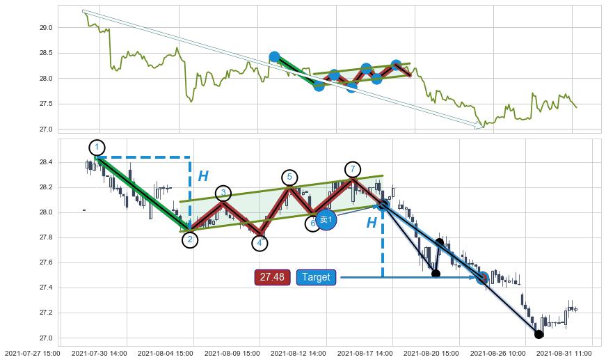 🦴 长线均值回复组合短线趋势跟踪[强阻力信号]2021-07-02 11:00-2021-08-27 12:00下跌趋势依然成立(下跌趋势跟踪依然存在),短线价格略微上行反弹(均值回复猜想),即将接近下跌趋势提供的未破位阻力价格:27.66。