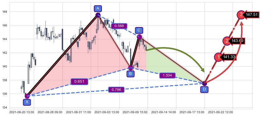 ➣ D点拟合预测价格137.51,距离最后交易收盘价格142.32相差 -3.38%
