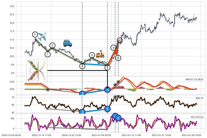 从2021-01-13 12:00至2021-01-25 11:00,共包含56个小时,阶段股价上涨9.56%,阶段股价变动位移路程比: 1 : 4