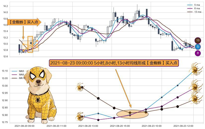 ⚀ 2021-08-23 09:00:00小时显现 5小时-8小时-13小时均线 【金蜘蛛】买入点 看多信号,后市看涨,买入