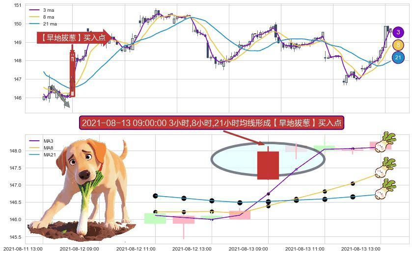 ⚀ 2021-08-13 09:00:00小时显现 3小时-8小时-21小时均线 【旱地拔葱】买入点 看多信号,后市看涨,买入