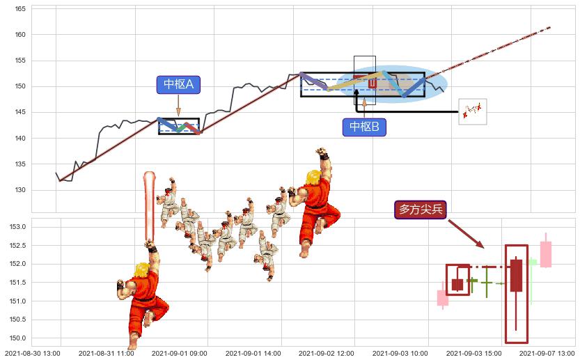 ➣ 【中枢B】:09-01:12-09-09:09,中枢由5笔构成,共32交易小时, ZG=151.30, ZD=149.33