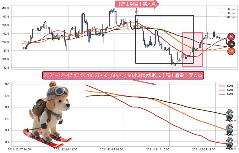 形态多维评估: ⚀ 2021-12-10 15:00:00小时-2021-12-23 09:00:00小时显现 30小时-60小时-90小时均线 【高山滑雪】买入点 看多信号,后市看涨,买入