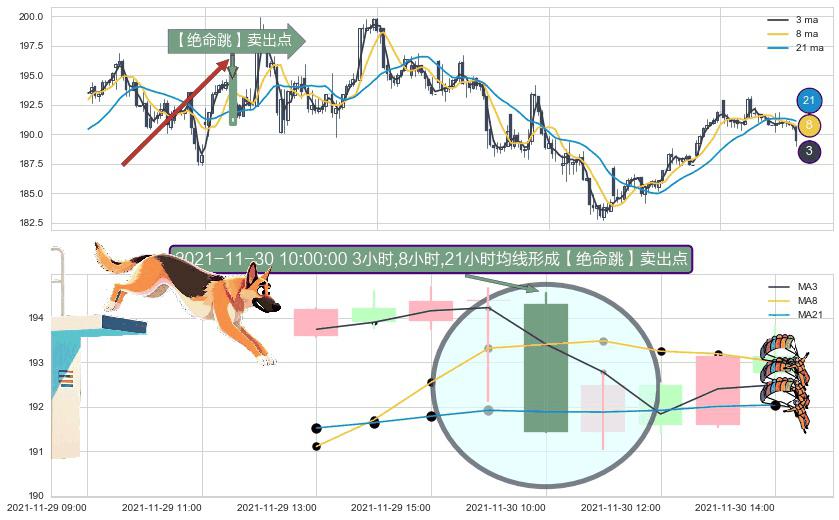 形态多维评估: ⚀ 2021-11-30 10:00:00小时显现 3小时-8小时-21小时均线 【绝命跳】卖出点 看空信号,后市看跌,卖出