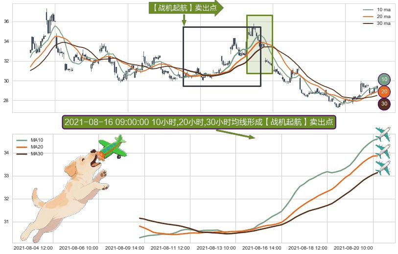 ⚀ 2021-08-09 13:00:00小时-2021-08-20 11:00:00小时显现 10小时-20小时-30小时均线 【战机起航】卖出点 看空信号,后市看跌,卖出