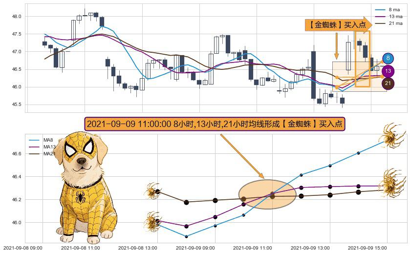 形态多维评估: ⚀ 2021-09-09 11:00:00小时显现 8小时-13小时-21小时均线 【金蜘蛛】买入点 看多信号,后市看涨,买入