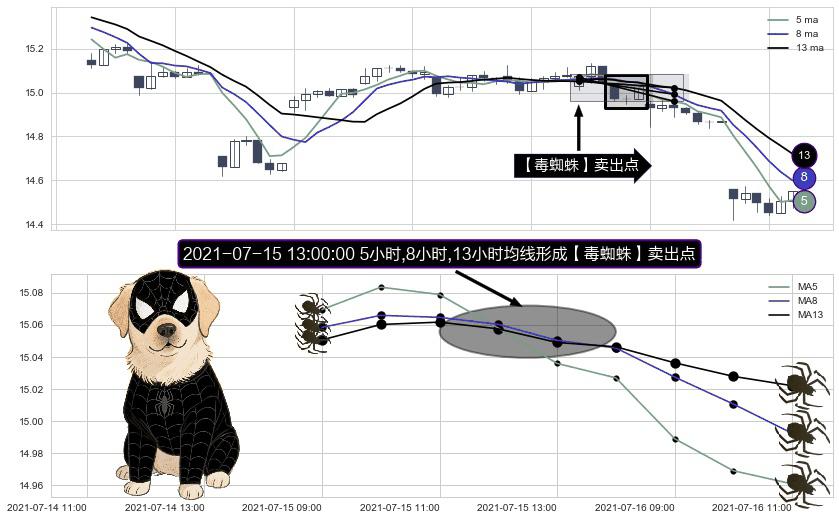 形态多维评估: ⚀ 2021-07-15 13:00:00小时显现 5小时-8小时-13小时均线 【毒蜘蛛】卖出点 看空信号,后市看跌,卖出