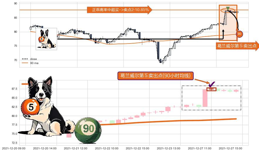 形态多维评估: ⚀ 2021-12-27 11:00:00-小时显现 葛兰威尔均线 90小时均线 第⑤卖出点 上升趋势均值回复的短线回落信号,后市看跌,卖出信号