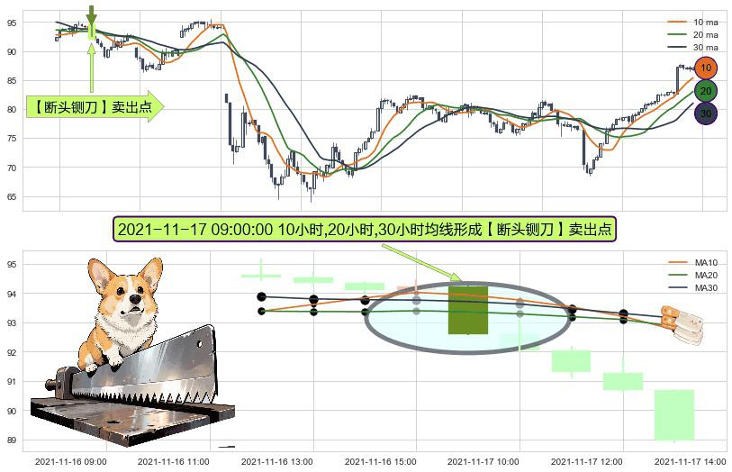 形态多维评估: ⚀ 2021-11-17 09:00:00小时显现 10小时-20小时-30小时均线 【断头铡刀】卖出点 看空信号,后市看跌,卖出