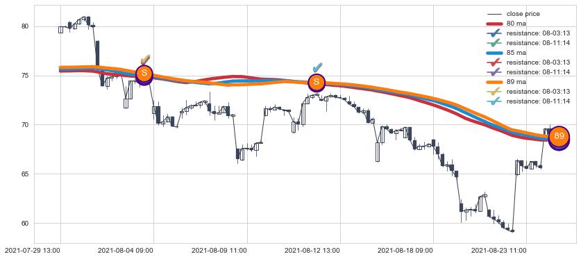 下跌趋势07-29 13:00-08-24 10:00,均线80, 89, 85确认关键阻力2处