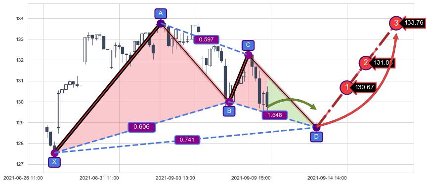 ➣ D点拟合预测价格128.76,距离最后交易收盘价格129.73相差 -0.75%