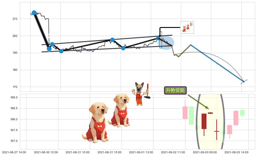 ♘ 在最后的下跌阶段2021-07-07 12:00至2021-09-09 15:00,存在 持续未破位的阻力位 ,阻力价格196.70,可信任强度85.34%,其距离最后价格188.93相差 +4.11%
