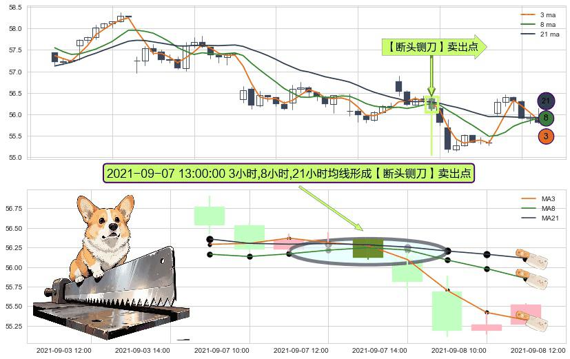 形态多维评估: ⚀ 2021-09-07 13:00:00小时显现 3小时-8小时-21小时均线 【断头铡刀】卖出点 看空信号,后市看跌,卖出