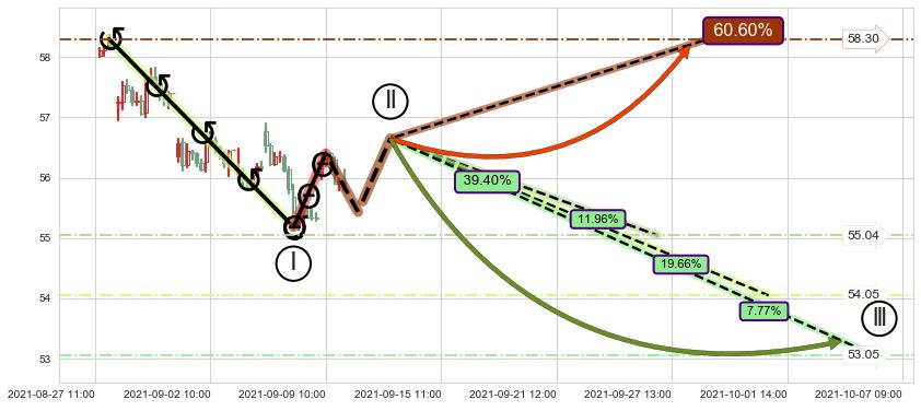 ➢ 循环浪继续向下【最低】位置(10-07:09, 53.05),匹配聚类样本比例19.74%, 可能性概率7.77%