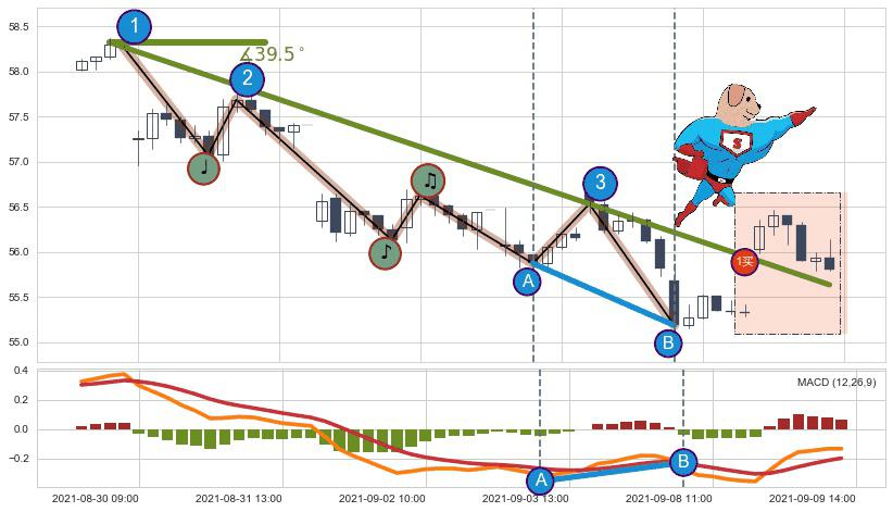 从2021-08-27 14:00至2021-09-08 13:00,共包含45个小时,阶段股价下跌-5.16%,阶段股价变动位移路程比: 1 : 3,下跌趋势角度: 39.5,2021-08-30 09:00向↘︎形成缺口,跳空下跌-1.74%˚