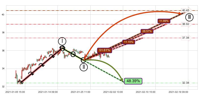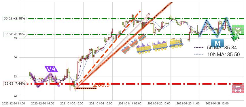 ♘ 支撑价格位32.63,可信任强度93.85%,距离最后交易2021-01-28 16:00形成的收盘价格35.25相差 -7.44%