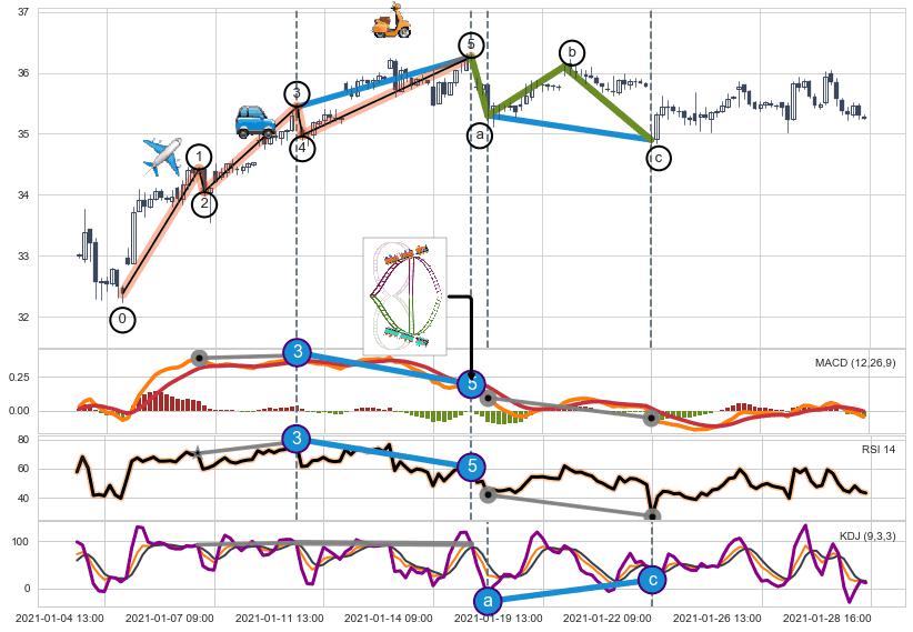 ➣ a, c调整浪端点:【KDJ】走势出现【常规背离 & 反转信号】背离程度67.65%,背离夹角角度61.8˚,背离程度较大