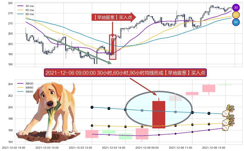 形态多维评估: ⚀ 2021-12-06 09:00:00小时显现 30小时-60小时-90小时均线 【旱地拔葱】买入点 看多信号,后市看涨,买入
