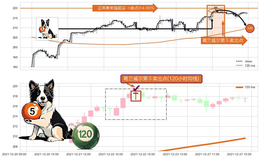 形态多维评估: ⚀ 2021-12-22 12:00:00-小时显现 葛兰威尔均线 120小时均线 第⑤卖出点 上升趋势均值回复的短线回落信号,后市看跌,卖出信号