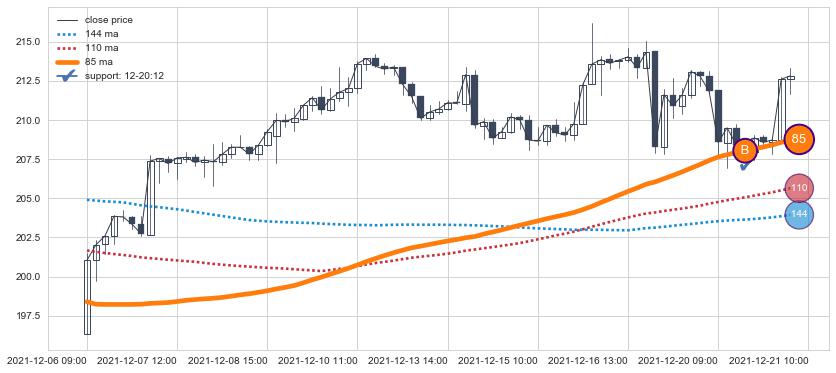 上涨趋势02-02 10:00-05-07 15:00,均线144, 85, 110确认关键支撑2处