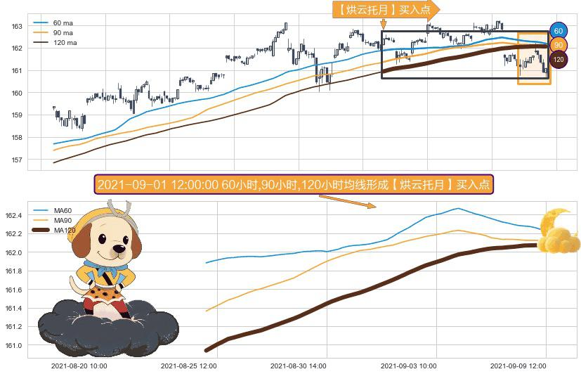 形态多维评估: ⚀ 2021-08-25 10:00:00小时-2021-09-09 13:00:00小时显现 60小时-90小时-120小时均线 【烘云托月】买入点 看多信号,后市看涨,买入